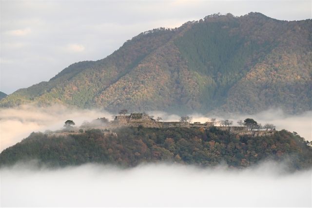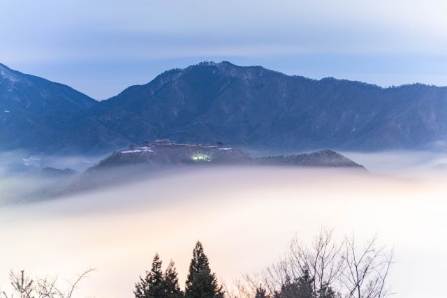 这座城真正扬名天下的,是它每年秋冬季节限定的“云海绝景”。当秋季的清晨温差足够大、风势微弱时,流经山下的圆山川便会升起浓雾,雾气缓缓升腾至山腰,将整座城址笼罩其中。
